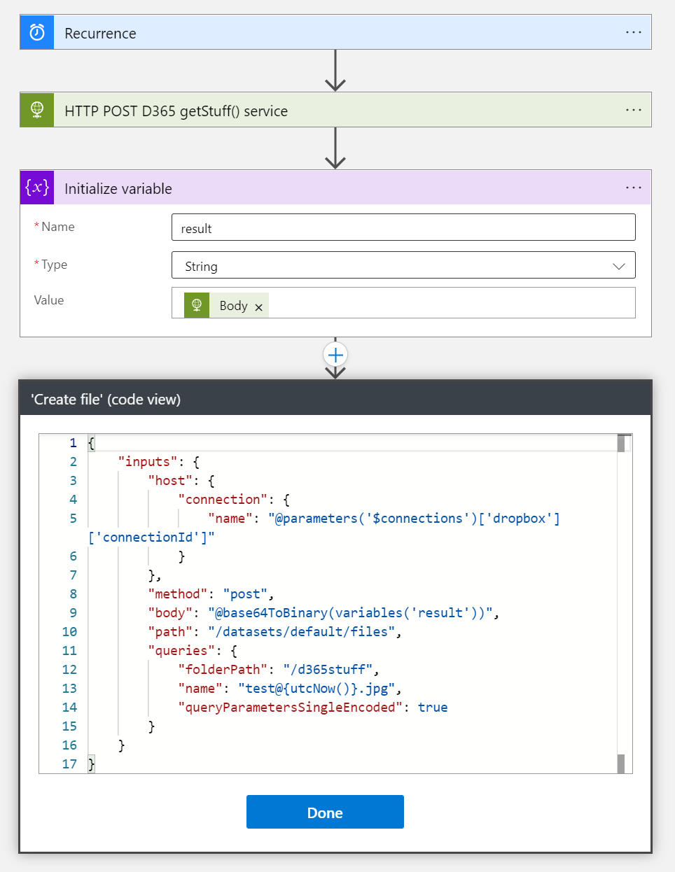 Here is the code view to better show the expression in File Content. The key method I use is base64ToBinary().