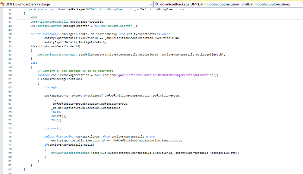 The DMFDefinitionGroupExecution::InsertOrDisplay method is the super helpful finale. If you peek in there, you'll see a lot of fussy work being done for you. Once you get your own DMFDefinitionGroupExecution record, you can do pretty much any DMF-related thing you want. My favorite use-case is calling the DMFDownloadDataPackage class to create a downloadable package: